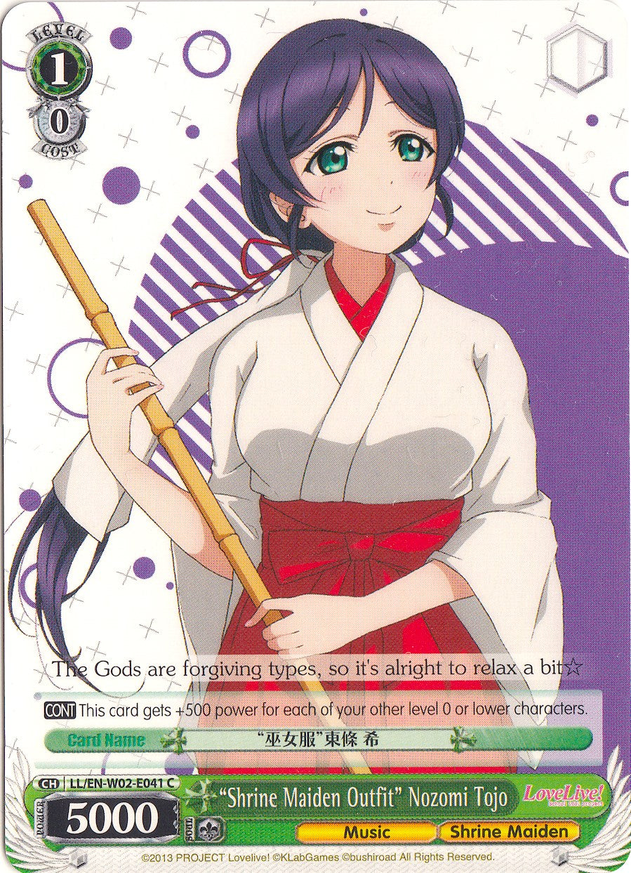 "Shrine Maiden Outfit" Nozomi Tojo (LL/EN-W02-E041 C) [Love Live! DX Vol.2]$0.30Release Date: 2016-08-26 Set Name: Love Live! DX Vol.2 Card Number: LL/EN-W02-E041 C ...