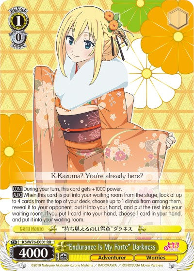 "Endurance Is My Forte" Darkness (KS/W76-E001 RR) [KonoSuba The Movie: Legend of Crimson]$3.30Release Date: 2020-10-23 Set Name: KonoSuba The Movie: Legend of Crimson Card Number: KS/W76-E001 RR...