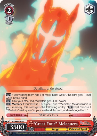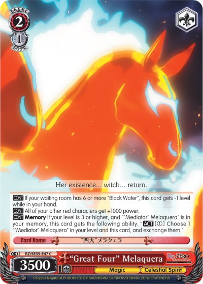 "Great Four" Melaquera (RZ/SE35-E47 C) [Re:ZERO: The Frozen Bond]$0.10Release Date: 2021-02-26 Set Name: Re:ZERO: The Frozen Bond Card Number: RZ/SE35-E47 C ...